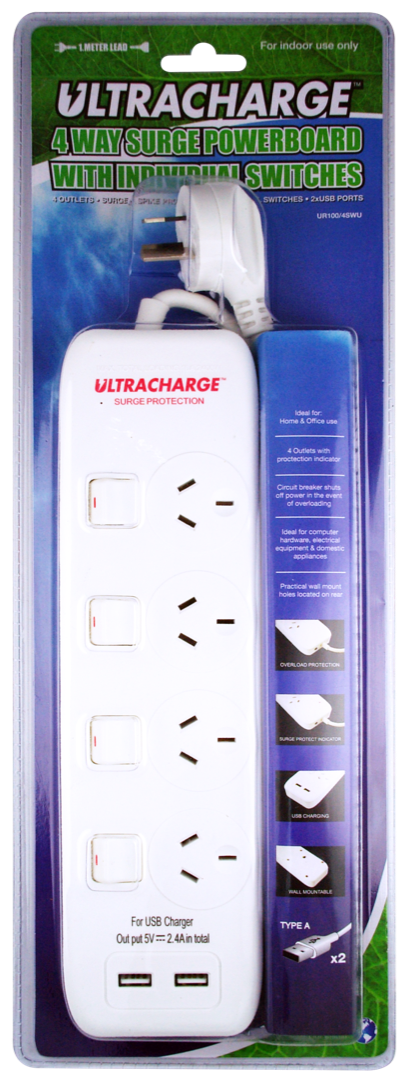 ULTRACHARGE POWER BOARD 4 SWITCH SURGE WITH 2xUSB 2.1A TOTAL